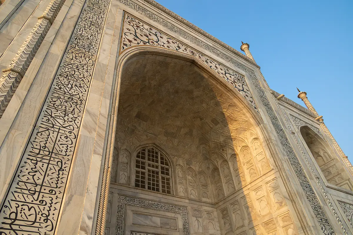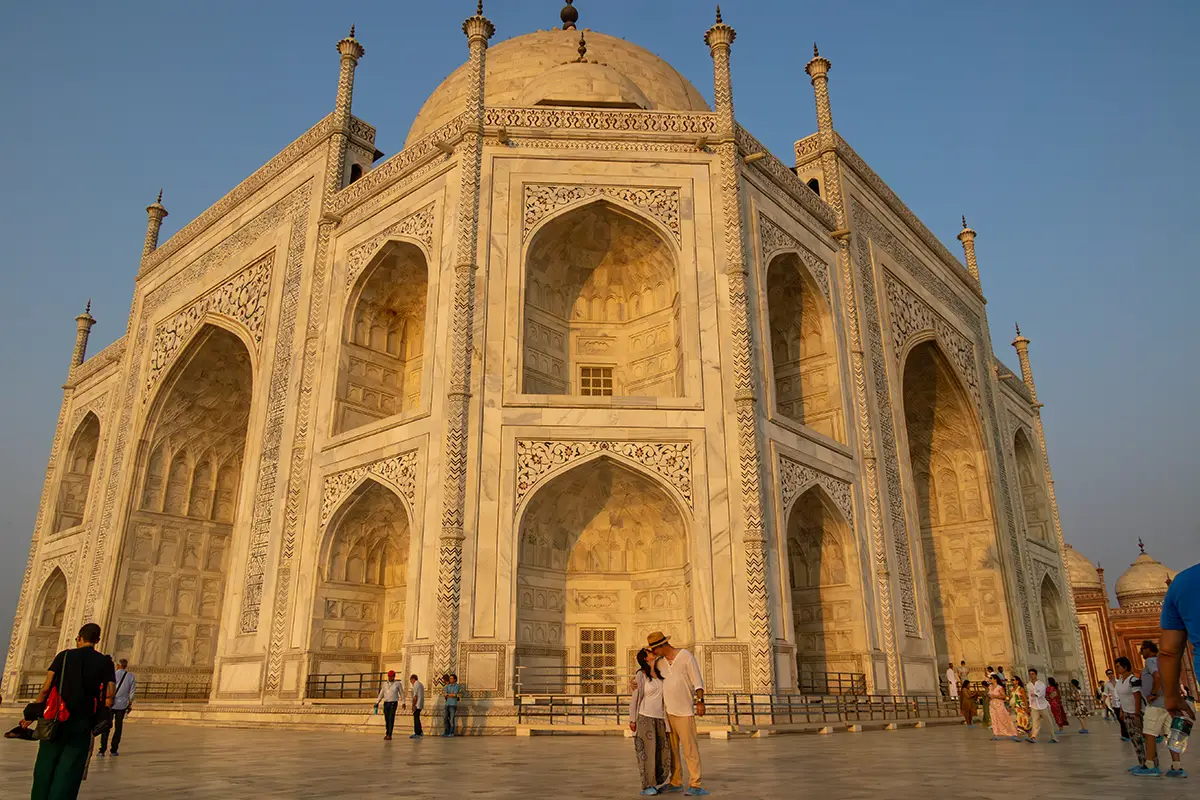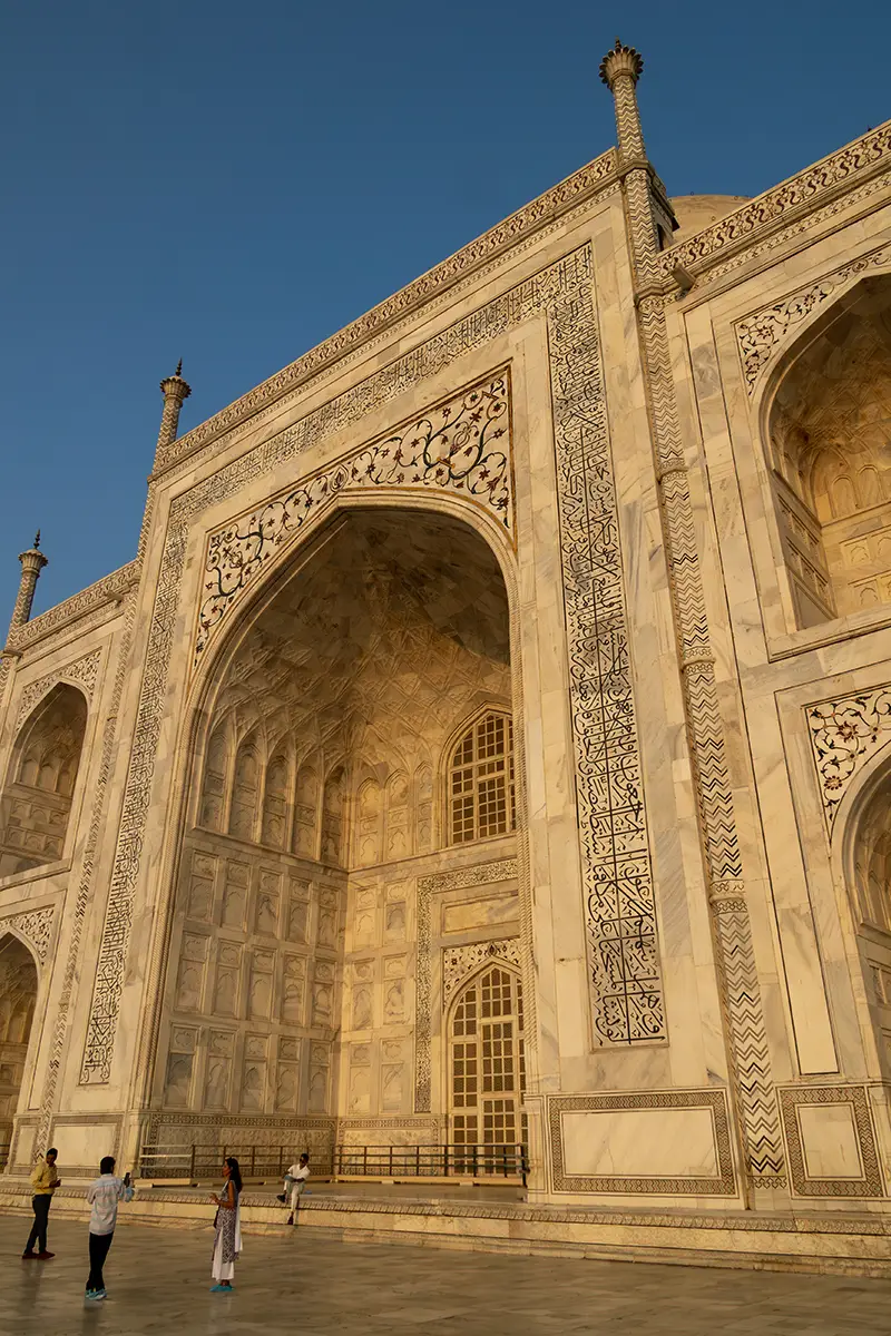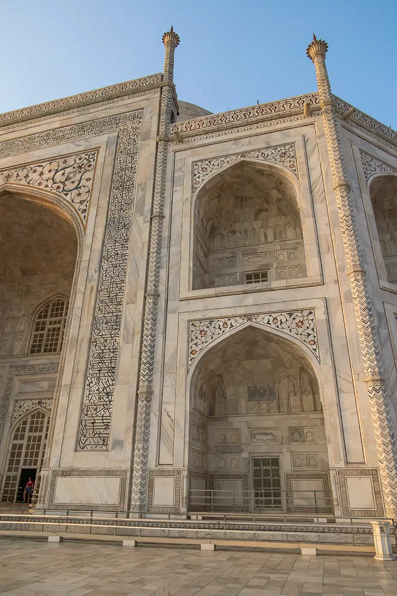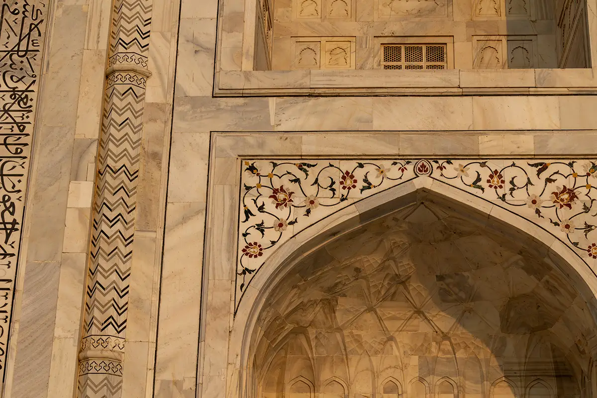 Das Mausoleum besteht aus weißem Marmor, der aus Makrana in Rajasthan stammt, und ist für seine detaillierten Verzierungen und edlen Materialien berühmt. Der zentrale Teil des Taj Mahal ist die große Kuppel, die von vier eleganten Minaretten umgeben ist, und der Bau ist symmetrisch angelegt. Der gesamte Komplex umfasst weitläufige Gärten, ein Wasserbecken, das das Mausoleum spiegelt, und ein prächtiges Tor. Besonders faszinierend sind die filigranen Marmorarbeiten und die Verwendung von Edelsteinen, die das Bauwerk schmücken.