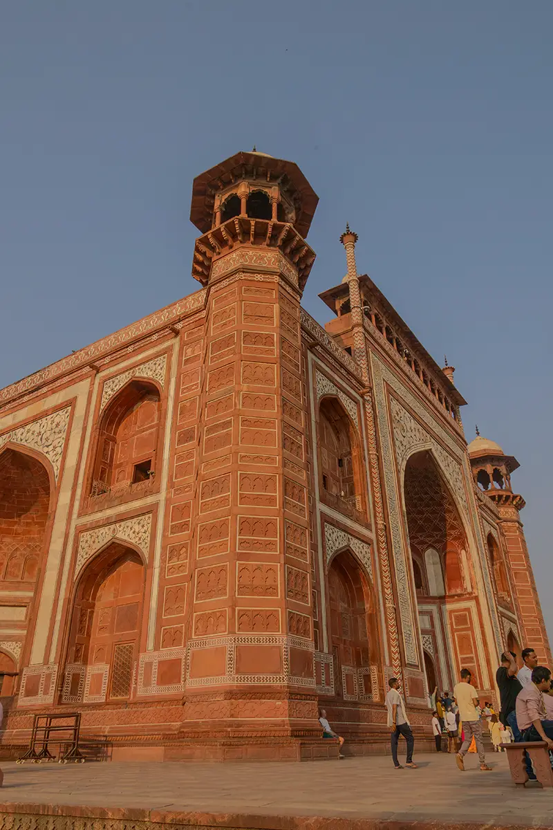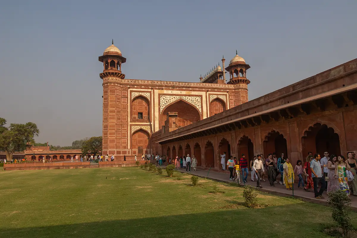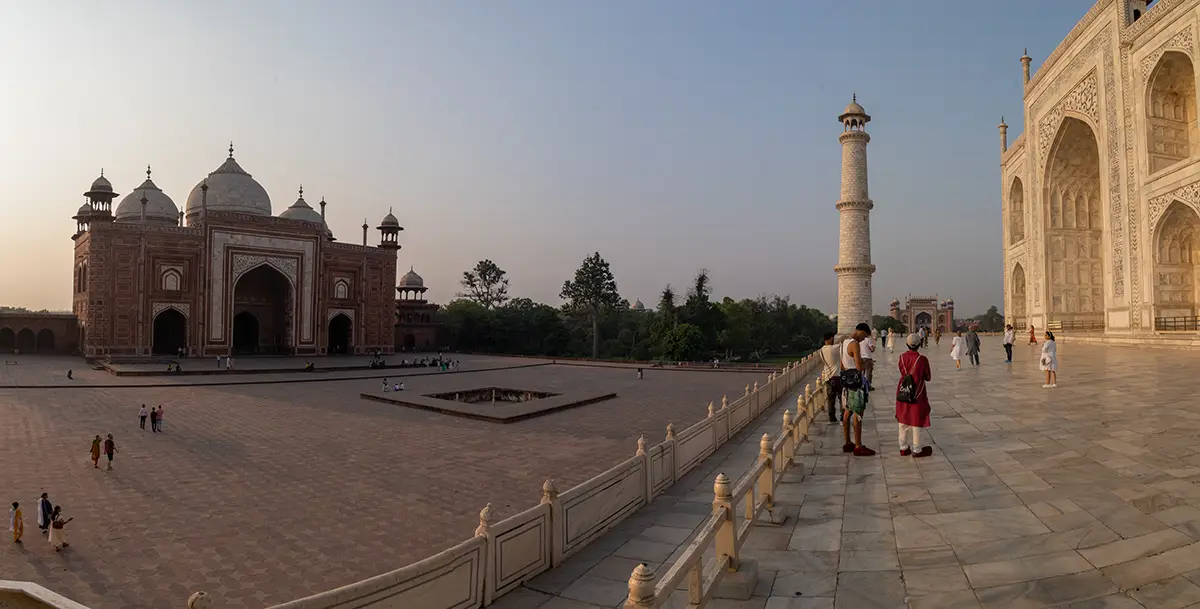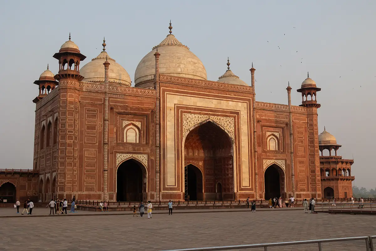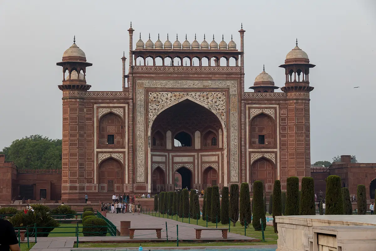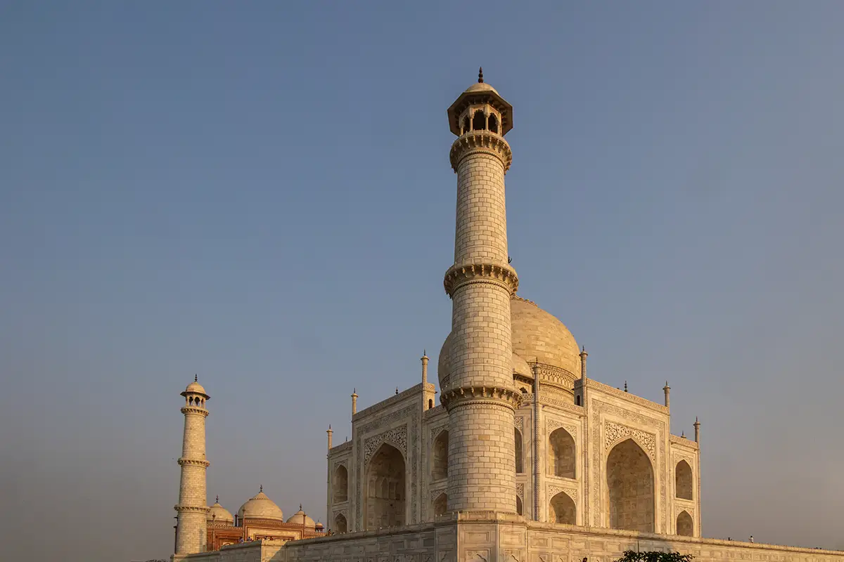 Das Mausoleum besteht aus weißem Marmor, der aus Makrana in Rajasthan stammt, und ist für seine detaillierten Verzierungen und edlen Materialien berühmt. Der zentrale Teil des Taj Mahal ist die große Kuppel, die von vier eleganten Minaretten umgeben ist, und der Bau ist symmetrisch angelegt. Der gesamte Komplex umfasst weitläufige Gärten, ein Wasserbecken, das das Mausoleum spiegelt, und ein prächtiges Tor. Besonders faszinierend sind die filigranen Marmorarbeiten und die Verwendung von Edelsteinen, die das Bauwerk schmücken.