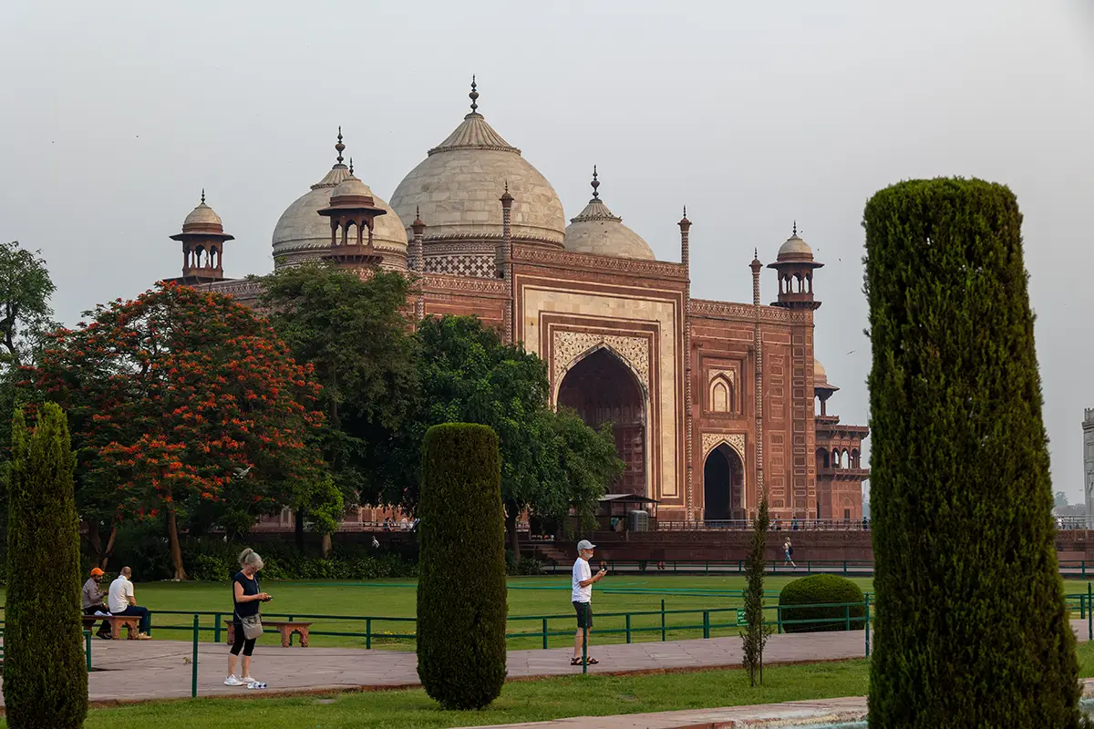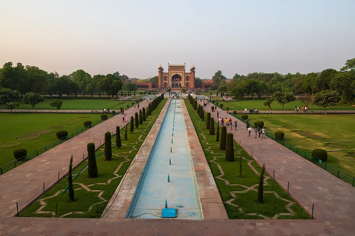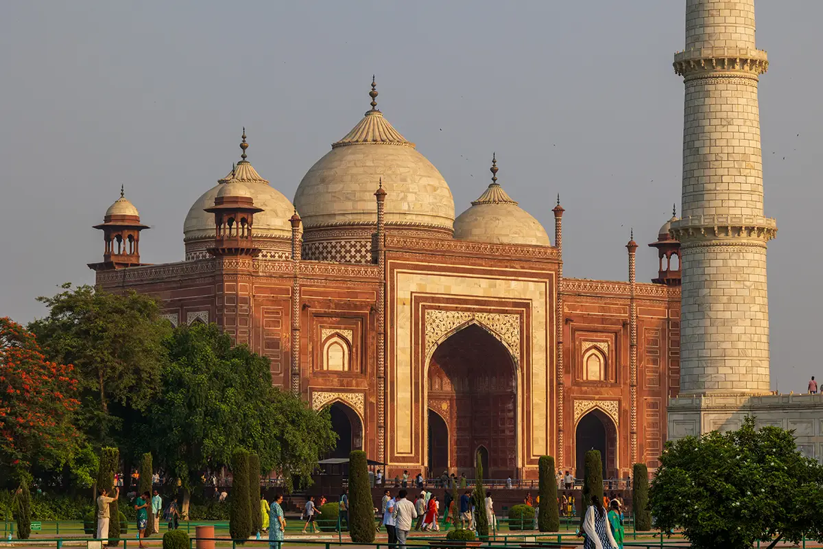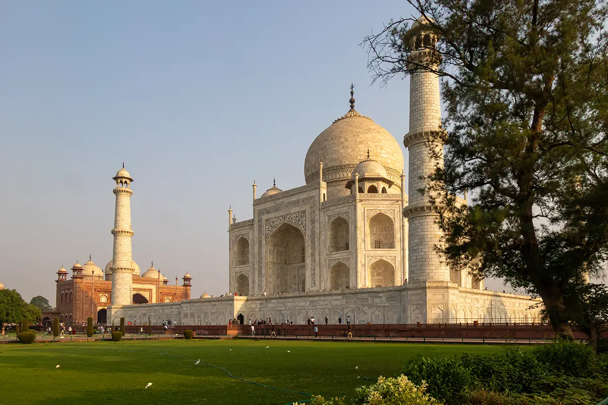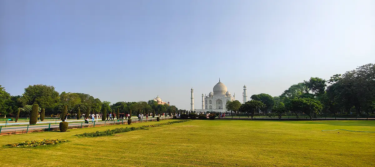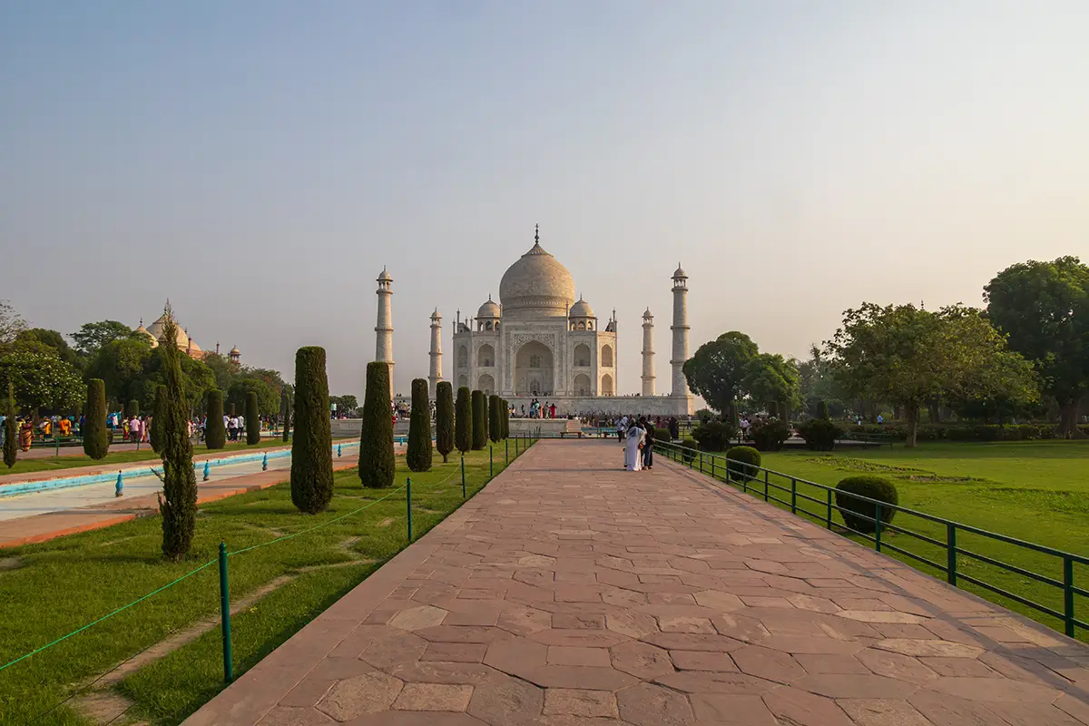 Das Mausoleum besteht aus weißem Marmor, der aus Makrana in Rajasthan stammt, und ist für seine detaillierten Verzierungen und edlen Materialien berühmt. Der zentrale Teil des Taj Mahal ist die große Kuppel, die von vier eleganten Minaretten umgeben ist, und der Bau ist symmetrisch angelegt. Der gesamte Komplex umfasst weitläufige Gärten, ein Wasserbecken, das das Mausoleum spiegelt, und ein prächtiges Tor. Besonders faszinierend sind die filigranen Marmorarbeiten und die Verwendung von Edelsteinen, die das Bauwerk schmücken.