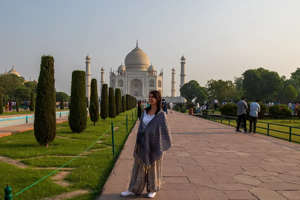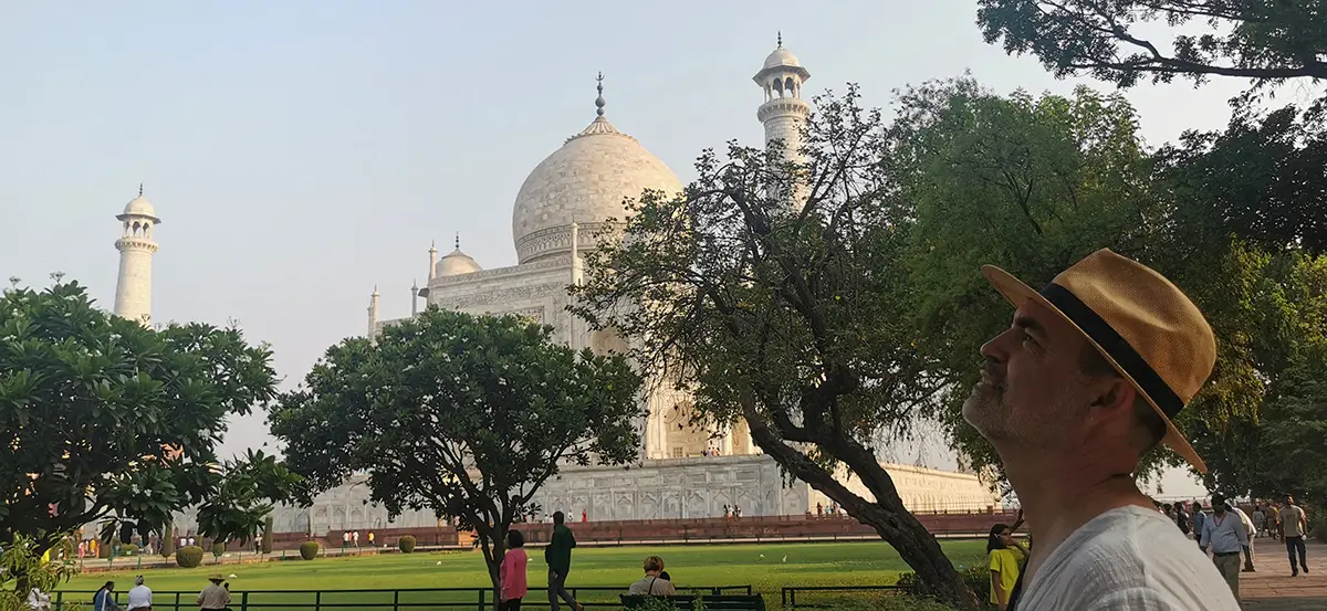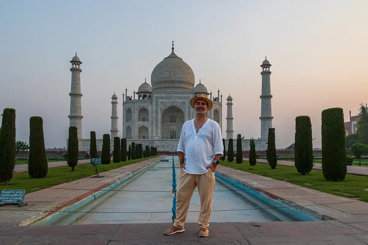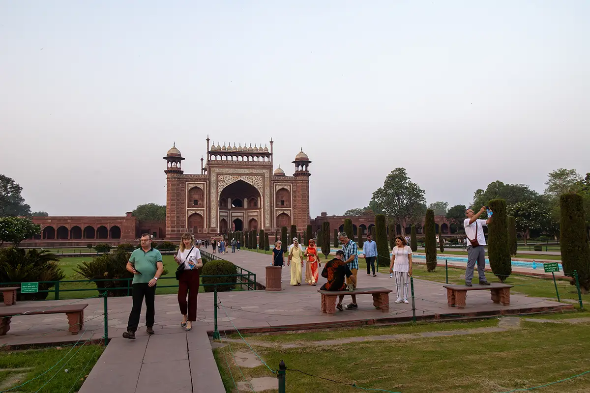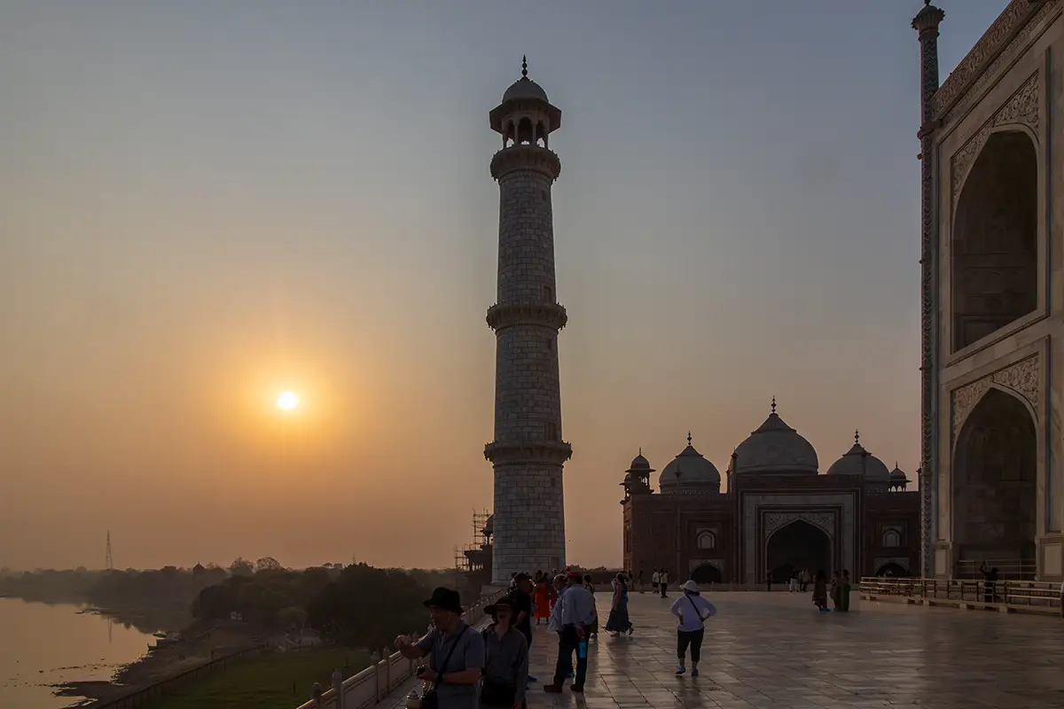 Das Mausoleum besteht aus weißem Marmor, der aus Makrana in Rajasthan stammt, und ist für seine detaillierten Verzierungen und edlen Materialien berühmt. Der zentrale Teil des Taj Mahal ist die große Kuppel, die von vier eleganten Minaretten umgeben ist, und der Bau ist symmetrisch angelegt. Der gesamte Komplex umfasst weitläufige Gärten, ein Wasserbecken, das das Mausoleum spiegelt, und ein prächtiges Tor. Besonders faszinierend sind die filigranen Marmorarbeiten und die Verwendung von Edelsteinen, die das Bauwerk schmücken.