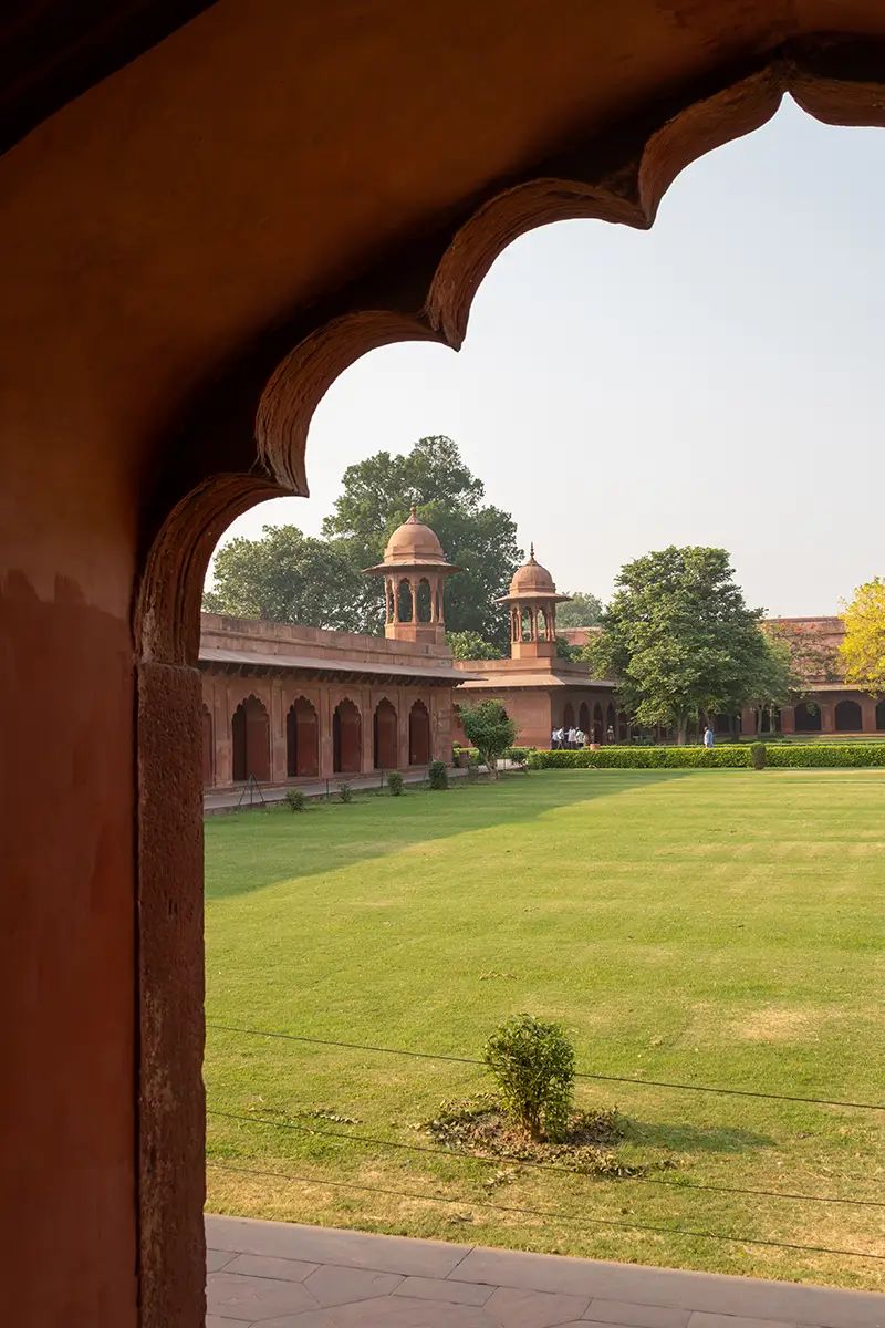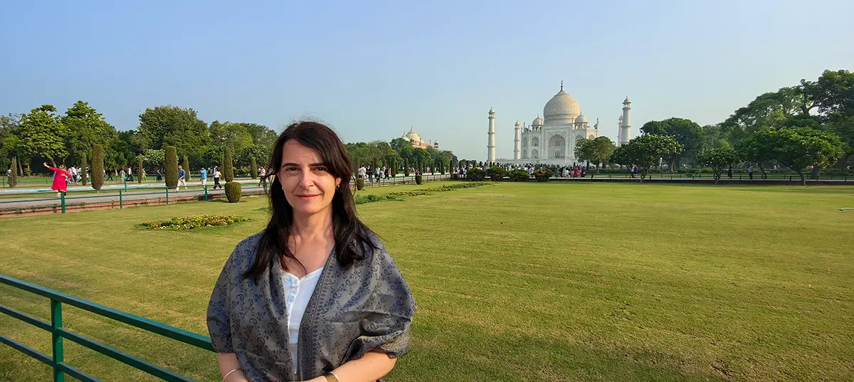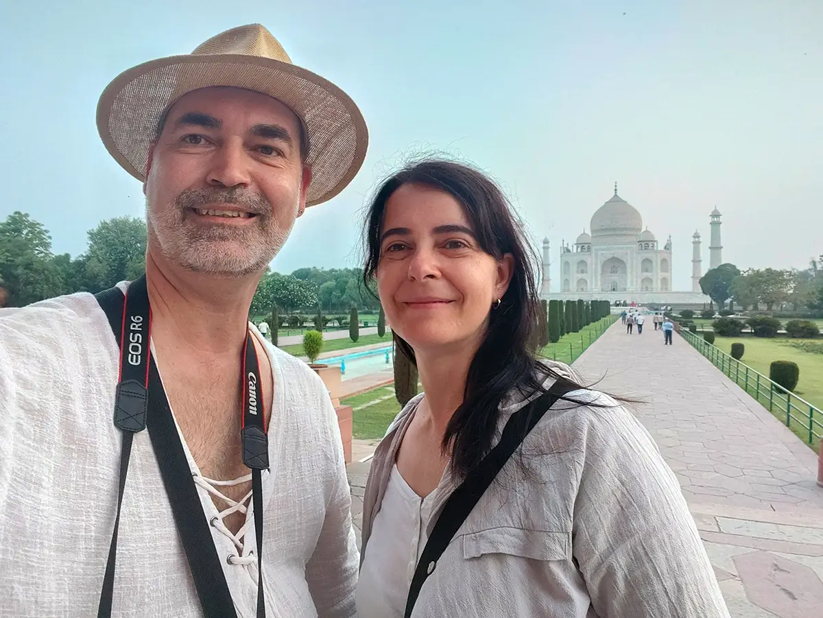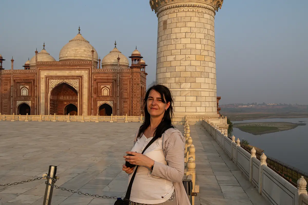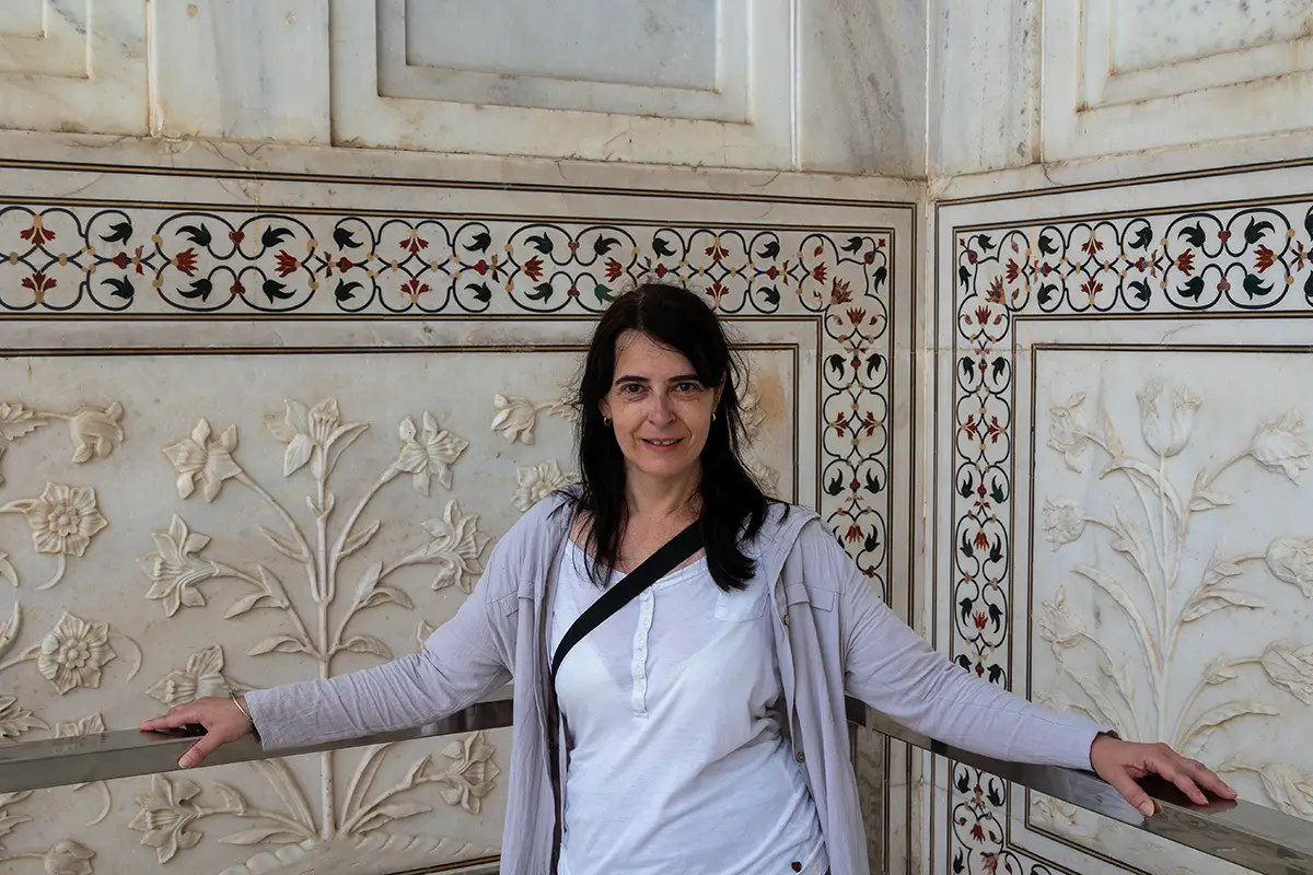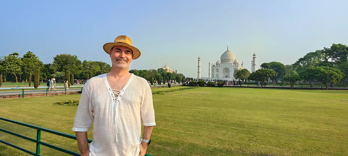 Das Mausoleum besteht aus weißem Marmor, der aus Makrana in Rajasthan stammt, und ist für seine detaillierten Verzierungen und edlen Materialien berühmt. Der zentrale Teil des Taj Mahal ist die große Kuppel, die von vier eleganten Minaretten umgeben ist, und der Bau ist symmetrisch angelegt. Der gesamte Komplex umfasst weitläufige Gärten, ein Wasserbecken, das das Mausoleum spiegelt, und ein prächtiges Tor. Besonders faszinierend sind die filigranen Marmorarbeiten und die Verwendung von Edelsteinen, die das Bauwerk schmücken.